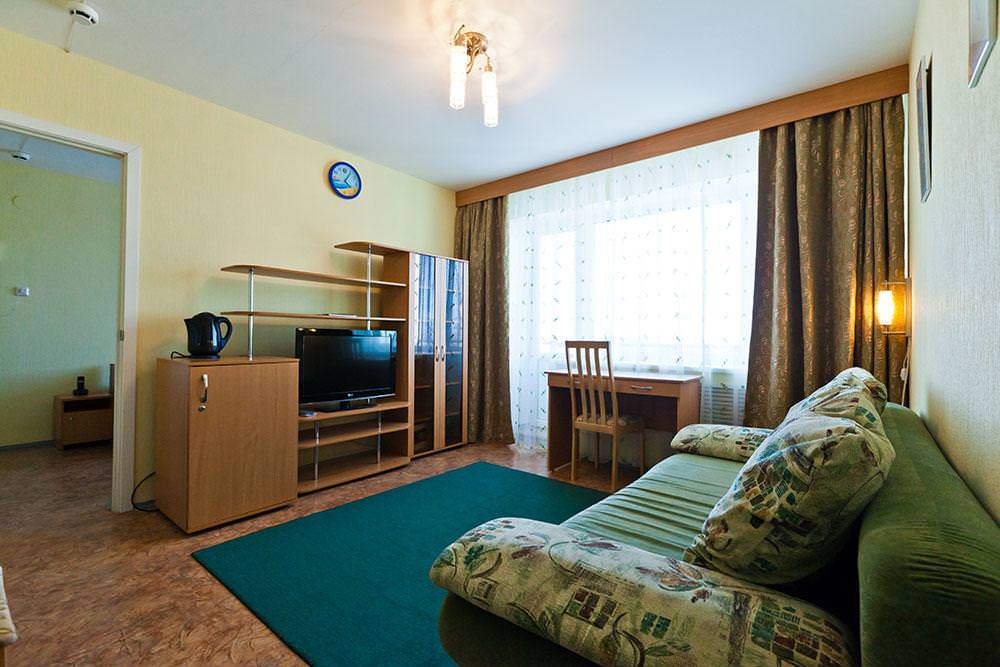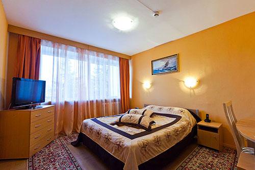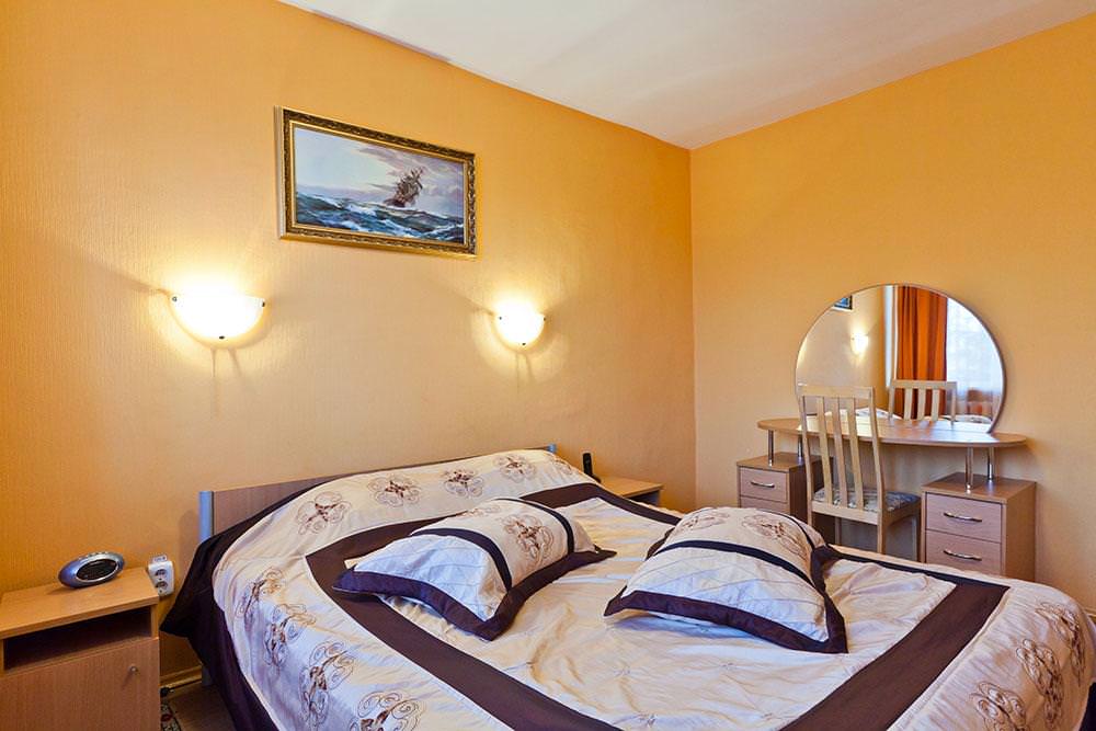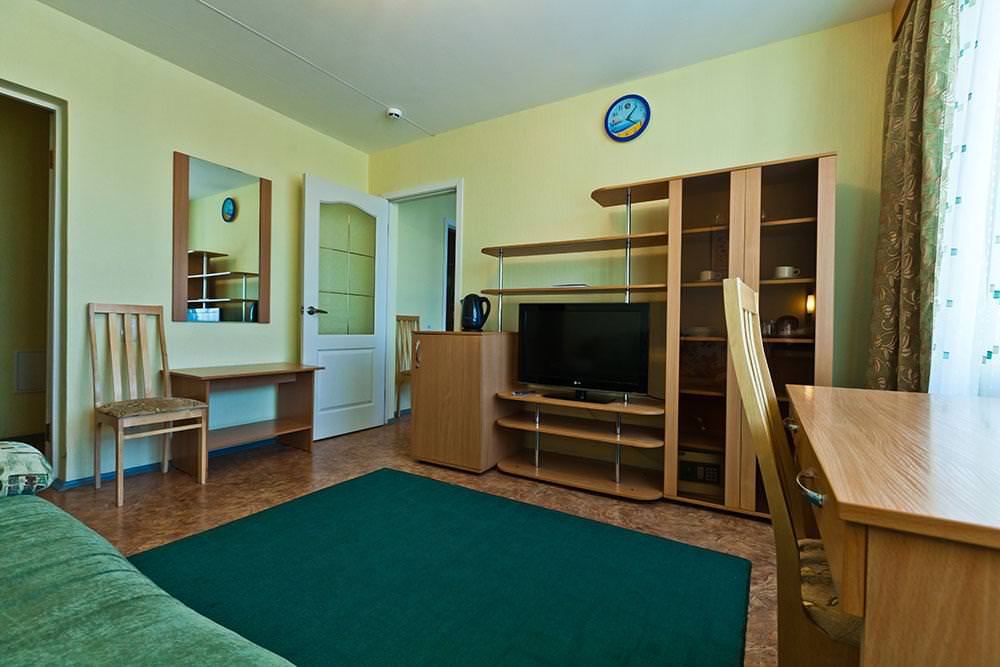 Площадь номера - 37 кв.м. В гостиной: мягкая мебель, стенка с посудой, журнальный стол, телефон, сейф, письменный стол, стул, холодильник, кондиционер, балкон. В большой спальной комнате: 2-спальная кровать, прикроватные тумбы, шкаф для одежды, стул, ТВ, телефон. В ванной комнате: душевая кабина, санузел совмещенные. В малой спальной комнате: 1-спальная кровать, прикроватная тумба, шкаф для одежды, косметический стол, стул, ТВ. Ванная комната. Номер оборудован электронным замком.