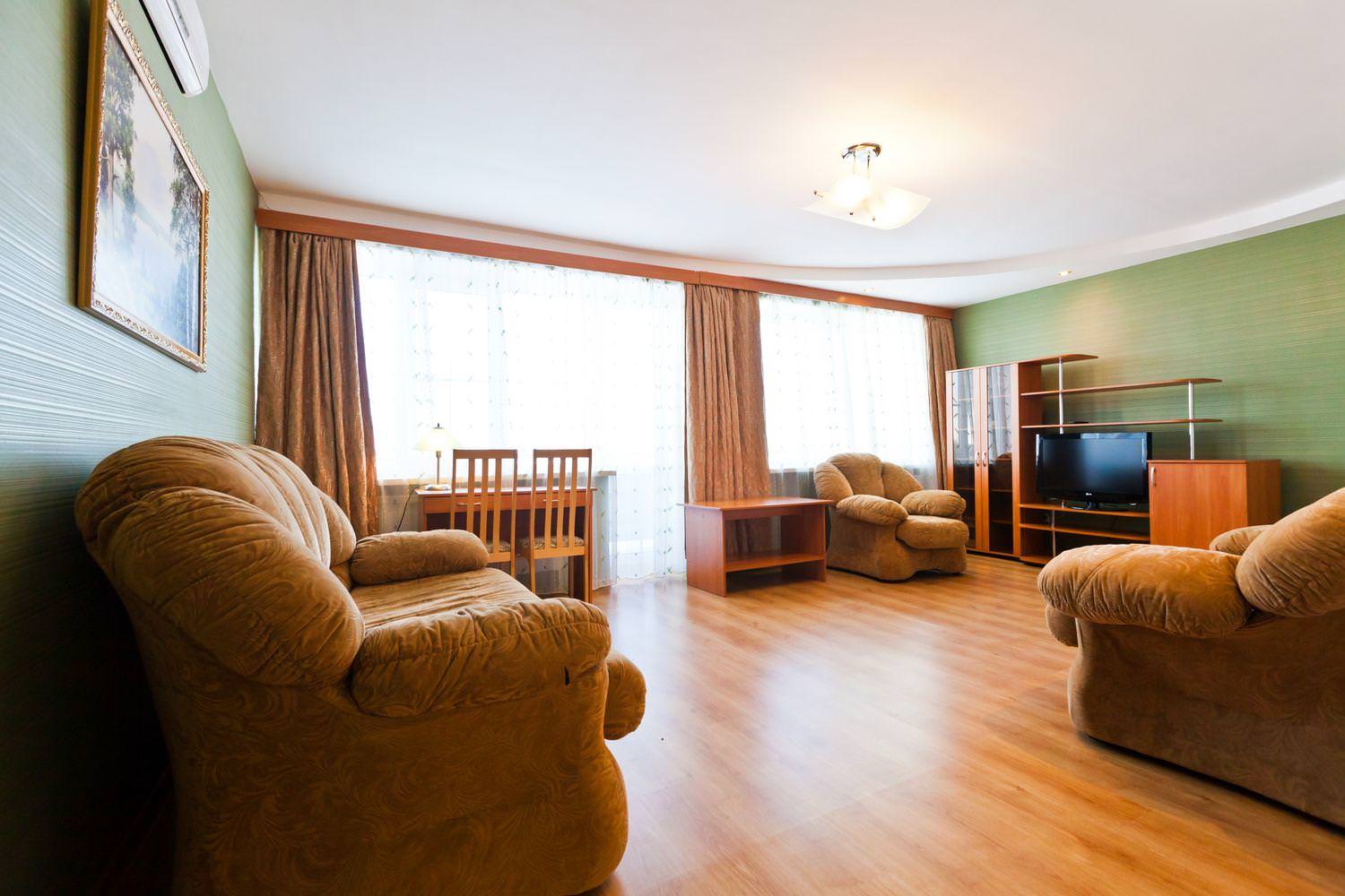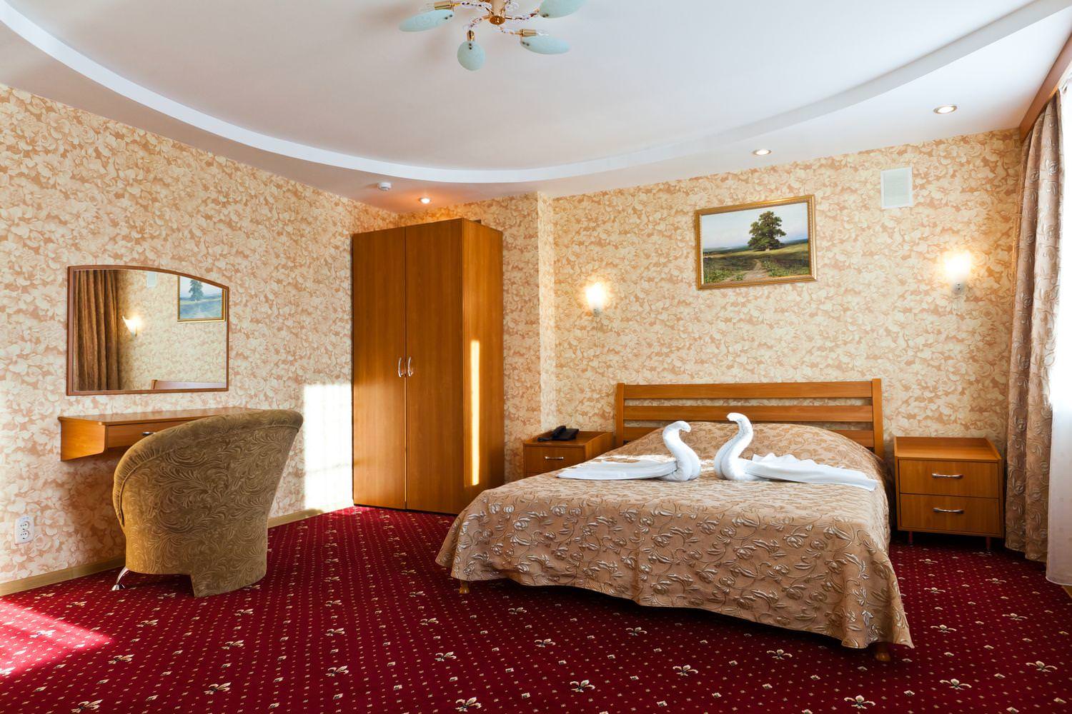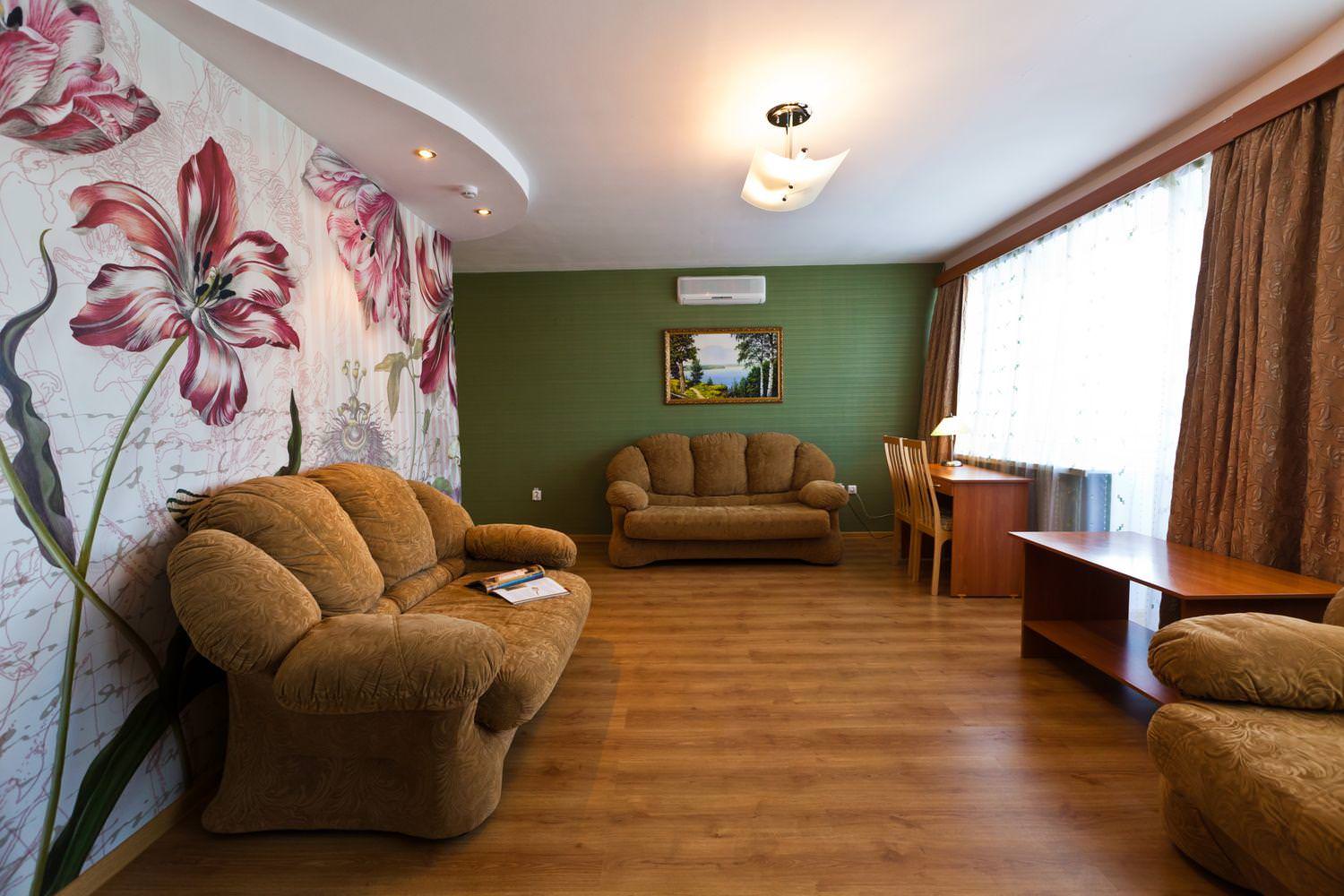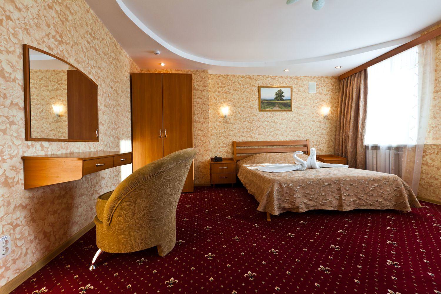 Площадь номера - 34 кв.м. В гостиной: мягкая мебель, стенка с посудой, ТВ, холодильник, журнальный стол, стулья, письменный стол, кондиционер, сейф, балкон. В спальной: 2-спальная кровать, прикроватные тумбы, косметический стол, мягкое кресло, шкаф для одежды, ТВ, телефон, кондиционер. В ванной комнате: душевая кабина и санузел совмещенные. Номер оборудован электронным замком.