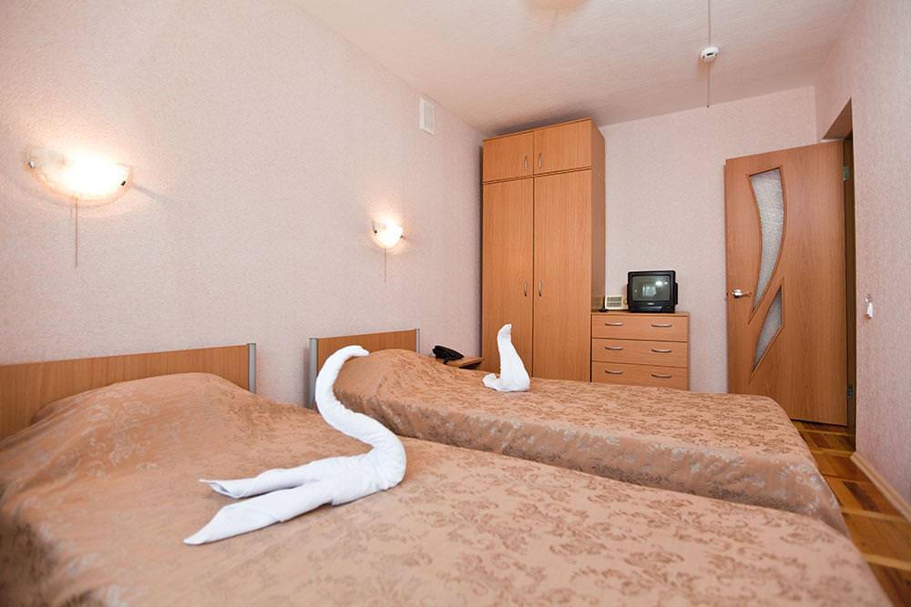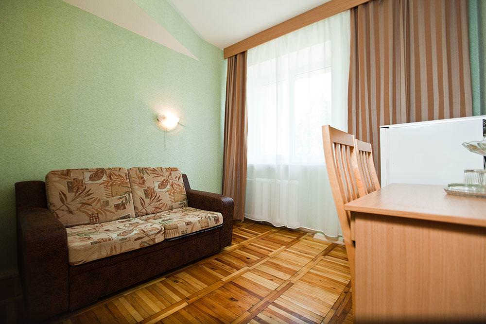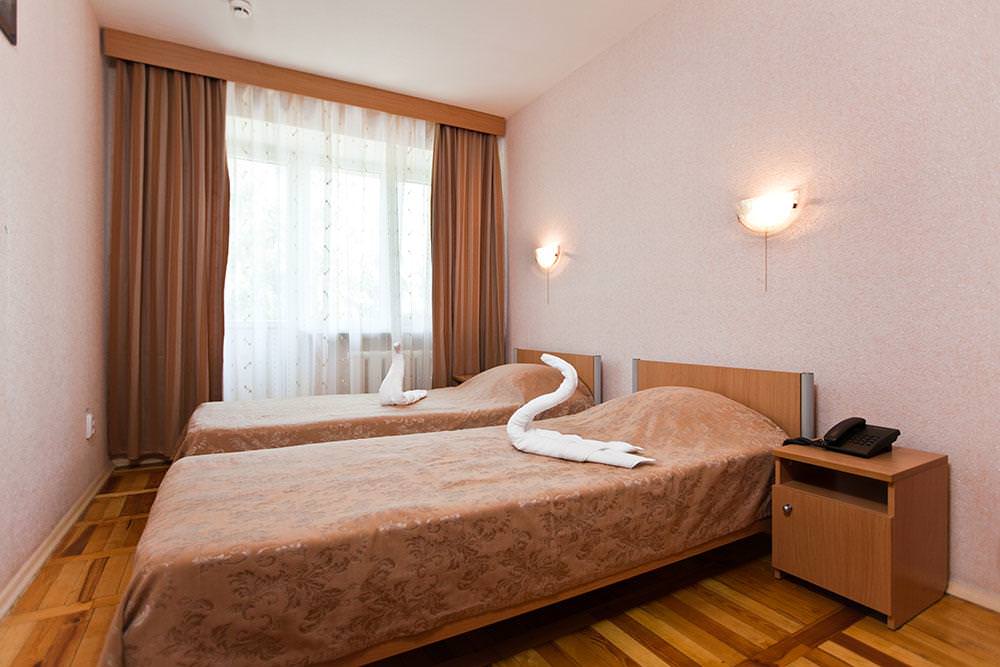 Площадь номера - 21,5 кв.м. В большой комнате: две 1-спальные кровати, прикроватные тумбы, шкаф для одежды, комод, ТВ, кондиционер, радио, телефон. Часть номеров с балконами, часть без балконов. В малой комнате: раскладной диван, письменный стол, стулья, холодильник. В ванной комнате: душевая кабина и санузел.