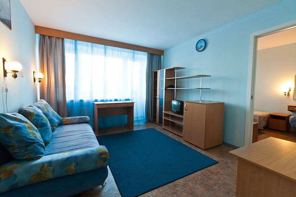 Площадь номера - 23,5 кв.м. В гостиной: раскладной диван, стенка для посуды, журнальный стол, ТВ, письменный стол, телефон, холодильник, сейф, кондиционер, балкон. В спальной: две 1-спальные кровати, прикроватные тумбы, гардеробная. Номер оборудован электронным замком. В ванной комнате: совмещенная душевая кабина и санузел.